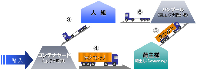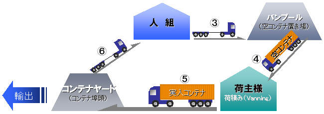 3. 空バン引き取り … 荷積み前日に、空バン(空のコンテナ)を引き取りに行きます。